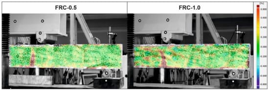 The course of the tests was monitored with the use of DIC which determined the development of cracks in beams. The CMOD presented in Figure 13 represents the evolution of the main cracks in the beams. They are the average of CMOD values obtained for three FRC-1.0 beams and one for the FRC-0.5 beam. In two other FRC-0.5 beams the main crack appeared in the zone not monitored by the DIC. Please note that because of technical limitations only the half of the beam could be observed. The results confirmed the better capacity of the FRC-1.0 beams to withstand loads than the FRC-0.5. The comparison of the views of the front surface of the selected beams monitored by the DIC are presented in Figure 14. The distribution of the principal strains at the moment when the CMOD is equal to around 0.2 mm is presented in Figure 14. In both beams only one crack was formed till the failure of the beam. However, it can be seen that for 0.5% of the fibres, the principal tensile strains are localised closer to the crack, while when more fibres are used (FRC-1.0) principal strains are more distributed in the whole zone of the constant bending moment, not only near the crack.