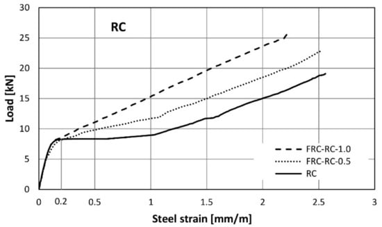 The diagram in Figure 19 shows the deformation of steel bars only in the elastic phase. After rapid change in steel strain, in range from 0.2‰ to 1‰ in RC elements, a further increase in load is associated with a gradual elongation. From a strain of about 1‰, all three lines (representing different fibres content) are almost parallel. This indicates the constant cooperation of the RSF with the conventional bars in this domain.