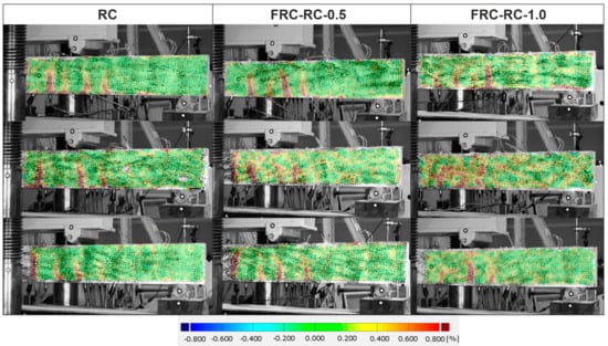 Distribution of the principal strain on the front surface of the RC/FRC–RC beams based on DIC.