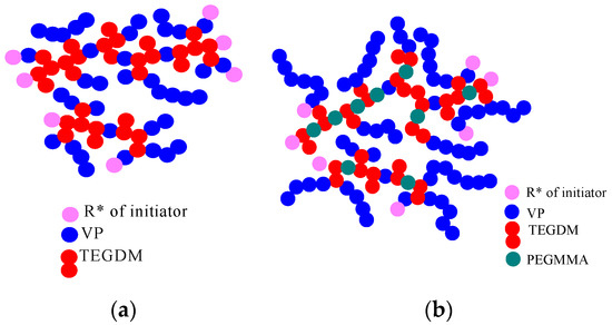 Schematic representation of possible topological structures of the copolymer br-VP-TEGDM (a) and br-VP-PEGMMA-TEGDM (b) copolymers.