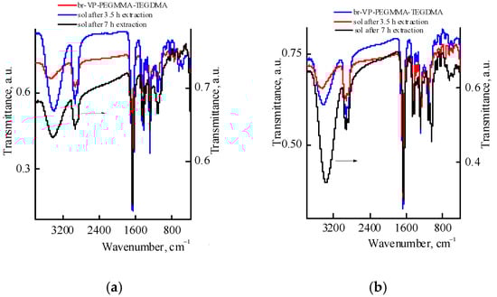 IR spectra (a) and 1H NMR (b) of br-VP-TEGDM and br-VP-PEGMMA-TEGDM copolymers, respectively.