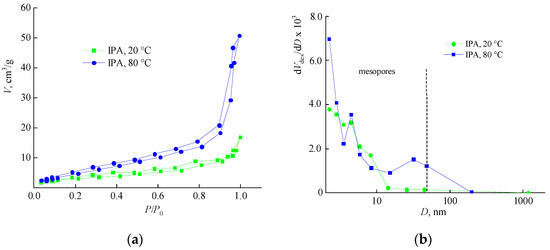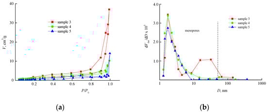 where P is the nitrogen pressure in the sample cell, P0 is the saturated nitrogen vapor pressure at 77 K, W is the weight of nitrogen absorbed at a given value of P/P0, Wm is the weight of the adsorbate in the surface monolayer, C is the parameter of the BET equation characterizing the adsorbent—adsorbate interaction. The value of the total pore volume, Vp was determined by measuring the amount of nitrogen adsorbed at the value of P/P0 close to 1. The pore size distribution curves were plotted using the Barrett, Joyner, and Halenda (BJH) method. The error in the determination of Vp and Ssp values did not exceed 7%.