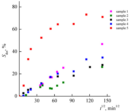 where ΔAads is the difference in the optical densities of the aqueous dye solution before and after adsorption and Ades is the optical density of the aqueous dye solution. The dependence of the Sdes value on time was plotted using the coordinates of the Fick equation.