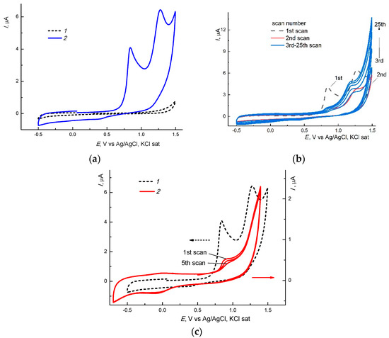 CVA-curves of oxidation of RB (~10−3 M) (a,b) and copolymer-bound RB (c) on a glassy carbon (GC) electrode (1 mm diameter) in PBS during the first (a) and subsequent (b) scans; 2—2nd scan; 3—3rd–10th scans. Dashed lines 1: (a)—background curve; (b,c)—curve 2 of Figure (a). v = 0.1 V ∙ s−1.