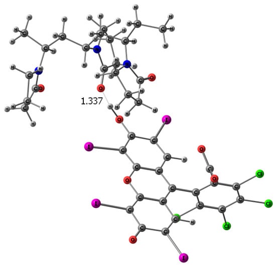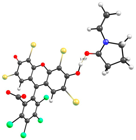 Thus, the experimental data indicate the interaction of RB molecules with a VP copolymer. Quantum chemical calculations of the possible intermolecular complexes were carried out, with the VP monomer and the protonated form of RB used as an example. It has been shown that the most preferable structure is a bvpb1 structure (Figure 14), which is formed due to the bonding of the oxygen atom of the carbonyl group of VP with an OH group of the xanthene ring of the dye.