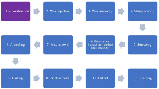The competitiveness of enterprises is very often associated with the implementation of the newest manufacturing techniques and corresponding control techniques, which translates into easier and faster satisfaction of the increase in customer requirements for manufactured products. At the same time, the development of more and more complex products entails the necessity to produce prototypes whose properties will correspond to the production (final) part as much as possible [1,2]. One of the techniques allowing for small-lot and accurate production of complex-shaped castings is the investment casting method [3], both in the traditional form and in the version based on 3D-printing technology [4].