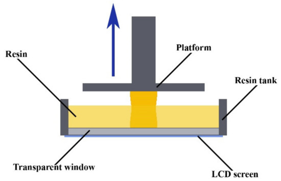 Due to the characteristics of the investment casting process, wax injection dies have high dimensional and geometric accuracy, as well as low surface roughness. Therefore, to produce the analyzed sample, the authors decided to use the photopolymer DPP 3D-printing technology, which is characterized by low minimal layer thickness (25 µm) and provides lots of different materials with an affordable price (USD 50–125 per liter). This 3D-printing technology uses light from LCD screens to create 3D-printed parts by curing liquid daylight photopolymer resin layer by layer. The diagram of the technology is shown in Figure 2.