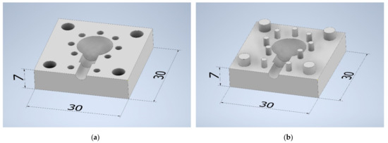 The 3D model of the designed injection die: (a) female part; (b) male part.