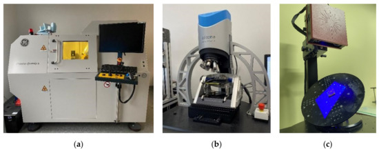Researchers used, presented in Figure 4a, the micro-CT device Phoenix V|tome|x S240 (Waygate Technologies, Wunstorf, Germany). The device consists of a transmission X-ray tube emitting a conical X-ray beam, rotating table where the tested sample is placed and the detector recording X-ray images corresponding to successive angular positions of the parts.