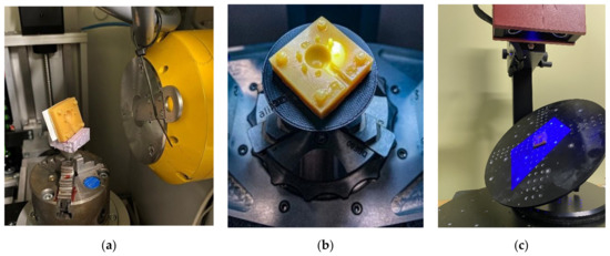The authors used the GOM Atos structured blue-light scanner system (Figure 4c) (GOM GmbH, Braunschweig, Germany). The scanner uses both triangulation and fringe-pattern projection to precisely measure even minute geometries within its resolution range. A drifting fringe pattern is projected onto a part and multiple exposures are taken and registered by two independent optical systems and then processed into a point cloud dataset. In order to accurately measure the parts, geometry reference points are placed in the measurement area. The operating principles of these techniques have been thoroughly described by many other researchers [27,50] and are widely in use, especially in the automotive and reverse-engineering industries.