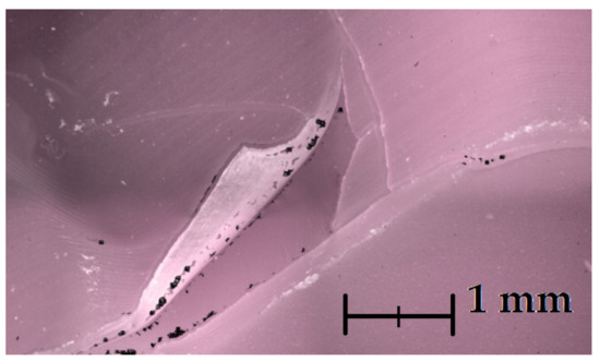 Image of a flaking site on the cylindrical section of the parts’ geometry created during the measurement with a focus variation microscope. A red hue is a side effect of using a polarized light source. Black spots are non-measured points.