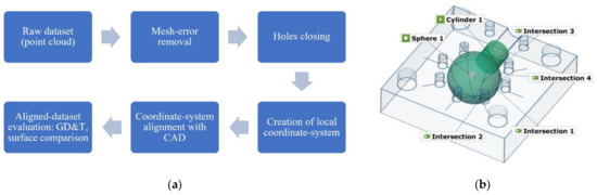 Each dataset was subjected to mesh-errors removal, and all holes within the measured area (a cavity consisting of a sphere and a cylinder) were closed using a smooth shape substitution based on neighboring points. Datasets from each measuring device were then subjected to an identical analysis scheme (Figure 7a) to determine deviations of dimensions, form, and position. Firstly, a local coordinate system based on geometric elements was created. The data for this system were: a parting plane, a cylinder, and a sphere’s center point, consecutively. The CAD model was also subjected to this procedure. Lastly, all datasets were aligned to the software’s Global Coordinate System and then exported as an STL file. This allowed for both surface data comparison to the CAD model, and to analyze the most significant geometrical features, as well as form and position deviations.