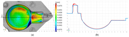 Printed element’s deviations: (a) from a fitted sphere and cylinder; (b) nominal (blue) and actual (red) cross-sections.