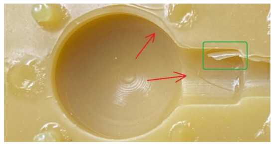 As stated before, the faulty element was deliberately chosen to test the systems’ ability to evaluate defects, e.g., cracks, bumps, and flaking. The investigated part was a 3D-printed injection die made of daylight flexible yellow resin (Figure 9). Numerous cracks on the parting plane, and one flaking zone, are visible with the naked eye. Cracks within the cavity are less visible and some may require the use of a magnifying glass.
