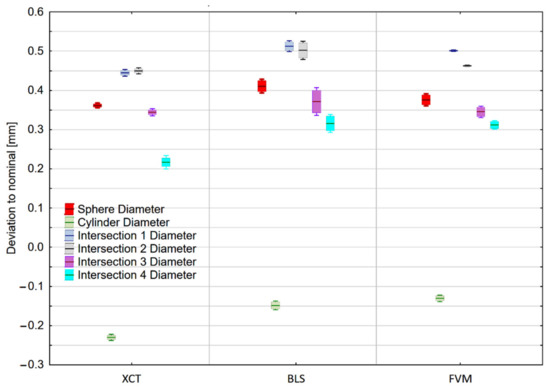 The following are available online at https://www.mdpi.com/article/10.3390/ma14226758/s1, Table S1: Measurement of the fitted circles’ diameters made with XCT, Table S2: Measurement of the fitted circles’ diameters made with BLS, Table S3: Measurement of the fitted circles’ diameters made with FVM, Table S4: Position tolerance values measured with XCT, Table S5: Position tolerance values measured with BLS, Table S6: Position tolerance values measured with FVM, Table S7: Roundness and cylindricity deviation values measured with XCT, Table S8: Roundness and cylindricity deviation values measured with BLS, Table S9: Roundness and cylindricity deviation values measured with FVM.