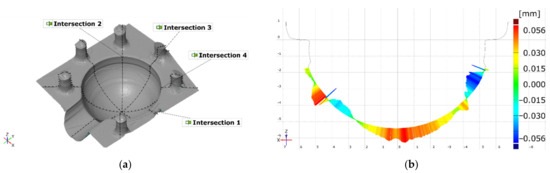 Both diameters are essential dimensions describing the examined mold. However, the researchers decided to evaluate the sphere’s radius along four, equally distributed planes pivoted around the Z axis. This would provide information on sphere-diameter variations in the main planes (Figure 8a,b).