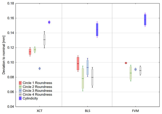 As seen in Figure 12, the lowest values of standard deviation of the cylindricity measurement were recorded for the results from the XCT. This may be due to the most consistent representation of this feature, with no non-measured points and, therefore, most repeatable point selection for element creation. Other technologies achieved similar values of standard deviation. Both had significant amount of non-measured points prior to dataset preparation.