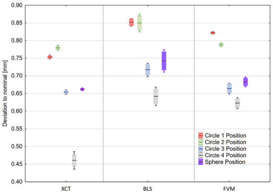 Positioning tolerances of fitted sphere and circles. Corresponding values of different elements are shifted for the purpose of data clarity. Box boundaries are equal to the standard deviation of the measurements, and whiskers represent the 95% Confidence Interval.