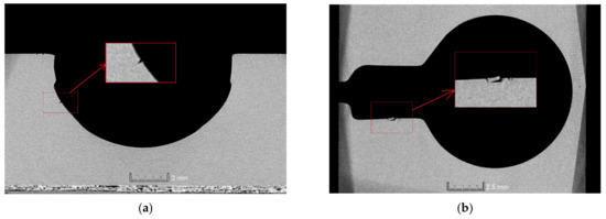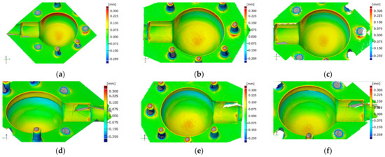 Surface comparison on aligned surfaces of both the actual data and the CAD model showed significant deviations in certain crucial areas. Firstly, the central area of the spherical cavity is elevated and flattened. The same observation can be recorded when analyzing cross section profiles (e.g., Figure 8b). Secondly, significant deformations can be seen in the proximity of the edges of the cylinder (Figure 14a–c). All measurement systems managed to detect the same artefacts on the cavity’s surface.
