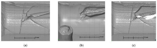 The flaking effect occurred within the cylinder area and was initiated from the crack that encircles the entire cavity. Each measurement technology was able to measure the flake to some extent. However, it was only fully measured when using the XCT device (Figure 16a). The blue-light scanner was able to measure only a small part of the flake (Figure 16b), while the focus variation microscope (Figure 16c) required an additional measurement of the flake (Figure 6). The focus variation microscope was not able to measure the whole flake. However, it managed to provide a detailed view on most of the surface.