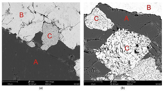 Composite microstructure of gray cast iron–β-SiC in the area of the matrix contact with the reinforcement, SEM; (a) mag. 500×; (b) mag. 3000×; (c) mag. 6000×; (d) mag. 6100×, nonetched sample; A—β-SiC reinforcement; B—metallic matrix (gray cast iron); C—transition zone 1.