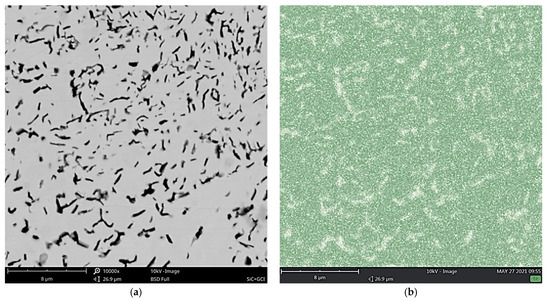 The transition zone under analysis, due to the phase composition, had mechanical properties located between the ceramic reinforcement and the cast iron matrix. This phase increased at the expense of the β-SiC particles, manifested by its rounded contact surface with the reinforcement particles. This surface was different from the raw β-SiC surface shaped by mechanical crushing. With a favorable and optimal proportion of morphology and dispersion, this type of transition phase may minimize the effects of the differential expansion of the two components of the composite and thus may affect its thermal properties. The differentiation of the degree of fragmentation of the flake graphite (Figure 6) indicates a locally variable intensity of the reaction. In addition to the effect of different wetting processes, this may also suggest a different reactivity of the β-SiC particle surface, which may also be justified by different specific surface, edge and tip energies of silicon carbide crystals forming polycrystalline β-SiC particles.