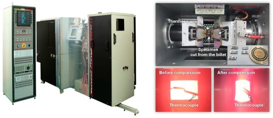 A hot compression test was performed using the Gleeble 3500 (Dynamic Systems Inc., Austin, TX, USA) thermomechanical simulator shown in Figure 1 to evaluate the strain rate and temperature-dependent strain hardening of homogenized and extruded 6063 aluminum alloy.