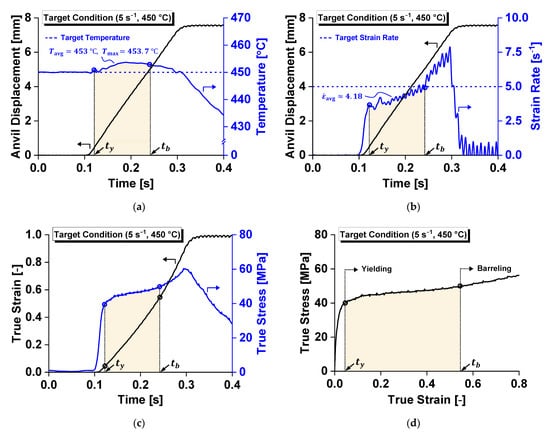 Figure 2 illustrates the variations in the strain, strain rate, temperature, and stress–strain relationship at a target strain rate of 5 s−1 and temperature of 450 °C, which were satisfactorily controlled during the compression test. Some differences between the target and evaluated strain rates are unavoidable owing to the difficulties associated with instantaneous feedback control considering the high stroke rate of the moving anvil.