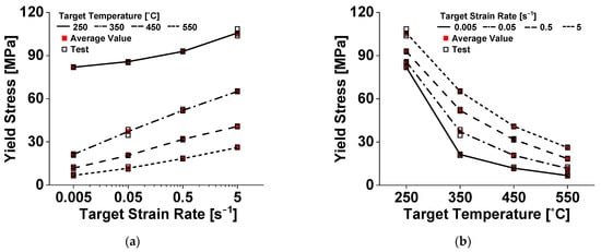Temperature-dependent compressive yield stress of Al 6063 alloy at target strain rates of: (a) 0.005 s−1; (b) 0.05 s−1; (c) 0.5 s−1; and (d) 5 s−1.
