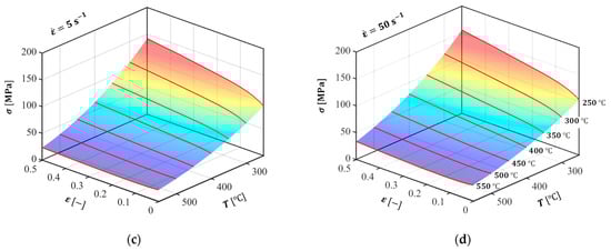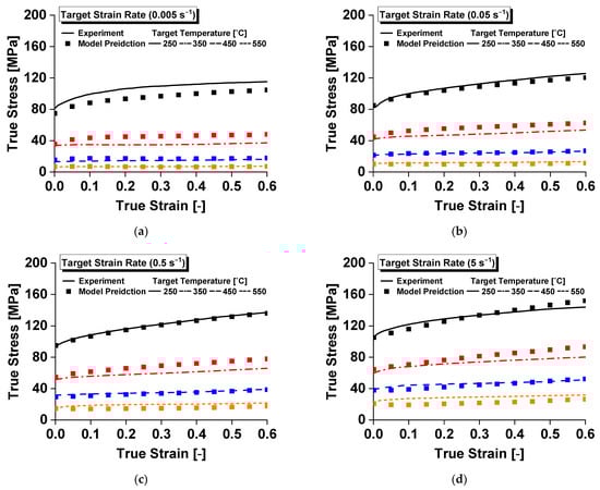 Flow stress responses predicted by the Arrhenius-type strain rate- and temperature-dependent strain hardening model: (a) 0.005 s−1; (b) 0.5 s−1; (c) 5 s−1; and (d) 50 s−1. The red lines represent the flow stress curves used in the FE analysis.