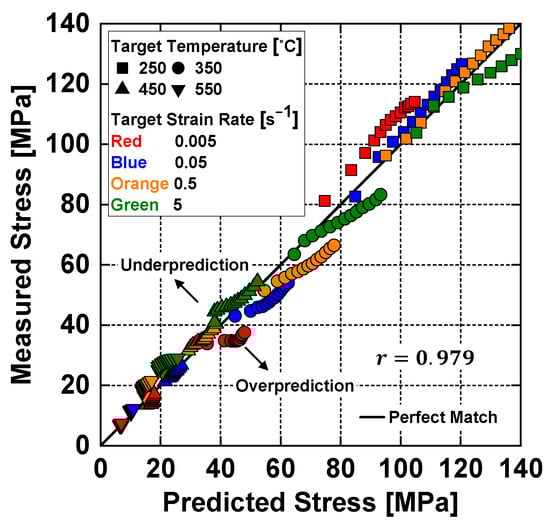 To evaluate the performance of the model in predicting the flow stress responses in Figure 4, the Pearson correlation coefficient, , was evaluated.