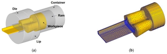 Numerical techniques for extrusion analysis under severe plastic deformations have also been developed to determine the cause of various defects and provide suitable countermeasures to prevent extrusion flaws, based on a comprehensive understanding of the physical mechanism and the variations in the state variables, such as strain, stress, and temperature, as the metal flows through the die orifice, which cannot be measured experimentally [10]. The updated Lagrangian (UL) method is commonly used in conjunction with various remeshing techniques to study severe plastic deformations that cause undesired distortions in the finite elements. This numerical approach has a strong effect on the direct evaluation of the transient behavior of the material flow in the cavity of the die during the extrusion process. Lee et al. [11] studied uniform microstructure generation based on a die profile optimization method that employs a thermomechanical finite element (FE) model, considering the microstructure evolution that occurs during the hot extrusion process. Zhou et al. [12] simulated the entire cycle of aluminum extrusion through transient and steady states using the DEFORM 3D software, based on the UL approach. Numerical observations of physical quantities such as the velocity, equivalent strain, and billet temperature revealed that the extrusion process occurs under non-steady-state conditions even in the steady-state, due to continuous heat generation and sticking conditions between the billet and the container interface. Li et al. [13] investigated the formation mechanism of transverse welds, considering the metal flow mechanism in aluminum extrusion, to provide general guidance. Donati and Tomesani [14] presented a general methodology to predict the weld quality in extruded aluminum profiles by evaluating the pressure, flow stress, and velocity fields on the welding surface through numerical analyses.
