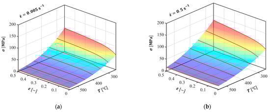 Combining the Arrhenius-type equation and the Zener‒Hollomon parameter given by Equations (1)–(3), the flow stress response can be expressed in an explicit form that includes the state variables of the strain, strain rate, and temperature: