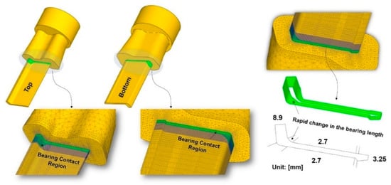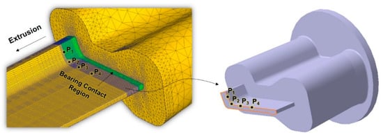 Figure 6b represents the discretization of the workpiece with a controlled mesh size, especially for the bearing and its regions, considering the accuracy and computational efficiency of the numerical analysis. The total number of elements and nodes generated were 247,284 and 50,330, respectively. The boundary conditions of the extrusion analysis were established, as listed in Table 3, considering the operating processes of aluminum extrusion in the industry. Thermal properties from the DEFORM library were applied to describe the heat transfer between the contact pairs.