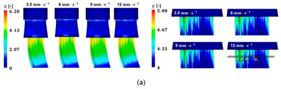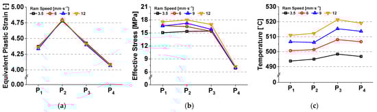 Comparing the results at each material point, the localized stress and temperature increase with the increase in ram speed. However, the variations in the equivalent plastic strain are almost negligible as the ram speed increases, as shown in Figure 11.