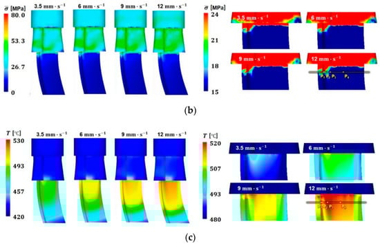 Figure 10 presents the distribution of the equivalent plastic strain, von Mises effective stress, and temperature, together with their magnified views. The results of the FE analysis indicate that severe plastic deformation is localized in the region where the bearing length changes rapidly. In addition, the temperature at the localized strain region also increases with the increase in ram speed.