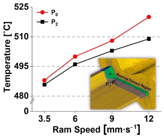 This implies that the extent of material deformation is likely associated with the final geometric shape of the workpiece, including the bearing length and the form of the internal cavities of the die, under the given extrusion conditions. Meanwhile, the increase in the localized temperature between P2 and P3 indicates a relatively strong dependence on ram speed compared to the strain and stress. Furthermore, the high level of temperature localization can be rapidly initiated, particularly at P0, where the bearing length starts to change significantly, as shown in Figure 12. This observation is possibly due to the additional frictional heat that is primarily generated by the increase in the relative velocity between the contact region of the bearing and the workpiece, and is relevant to the volumetric metal flow at the bearing outlet.