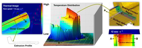 To investigate the temperature distribution along the workpiece during the extrusion process, thermal images of the workpiece were recorded using a Fluke Ti400 infrared camera (Fluke Corporation, Washington, DC, USA), with a thermal emissivity, ϵ = 0.25, as shown in Figure 14.