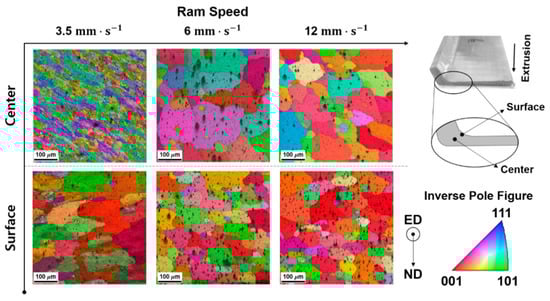Considering the numerical simulation results, the temperature concentration was experimentally observed along the region where the surface defect occurred. However, the absolute temperature recorded during the experiment could not be directly compared to the FE prediction as the thermal image only represents the relative temperature distribution, based on the thermal emissivity value. In addition to the macroscopic observation of the extrusion quality, metallurgical analyses were also performed at the surface defect sites, by measuring electron backscatter diffraction (EBSD) maps in plane parallel to the extrusion direction. It is noted that samples were prepared using a jet polisher (TenuPol-5, Struers Inc., Cleveland, OH, USA) and perchloric acid solution at 15 V, 250 mA. The microstructural analysis was performed by a field-emission scanning electron microscope (FE-SEM, FEI Quanta 200F, FEI Company, Hillsboro, OR, USA) operated at an acceleration voltage of 15 kV, after which EBSD patterns were collected using a TSL OIM system (EDAX, Inc., Mahwah, NJ, USA) with a step size of 0.1 µm. Comparing the grain size and orientation between the surface and the center, as shown in Figure 15, dynamic recrystallization and growth of grains caused by stored work (or flow stress) are clearly observed in center region, with the increase in ram speed at the same die temperature. On other hands, the grain size in surface region gradually decreased with the increase in ram speed, which was probably originated from recrystallization and growth of sub-grains in peripheral coarse grains due to the increase in flow stress and frictional heat generated between the bearing and the workpiece, as predicted by the numerical analysis.