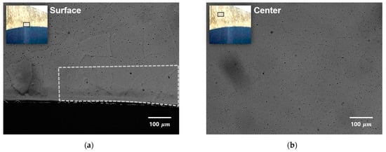 In addition to the EBSD analysis, we attempted to evaluate the surface roughness of both the defect and defect-free regions of the sample using SEM images that were recorded before and after removing the anodic oxidation layer on the surface of the sample. Based on the width of the die line and the grain size, no surface irregularities related to the early oxidation on the grain boundaries and precipitates could be observed, as shown in Figure 20.