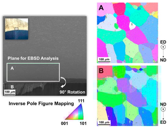 Inverse pole figure maps of the defective region: (A) parallel; and (B) perpendicular to the extrusion direction.