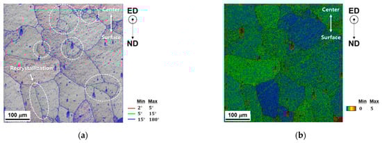 Rotation angle and kernel average misorientation (KAM) maps were obtained, as shown in Figure 19, to investigate the recrystallization due to the occurrence of high-density dislocation and estimate the distribution of the residual stress on individual measuring points to reveal preferable sites for grain corrosion. However, no severe deformation-induced grain boundary rotation or localized KAM traces between the surface and the center regions were detected. Furthermore, no pick-up mechanism was observed owing to inadequate homogenization of the billet.