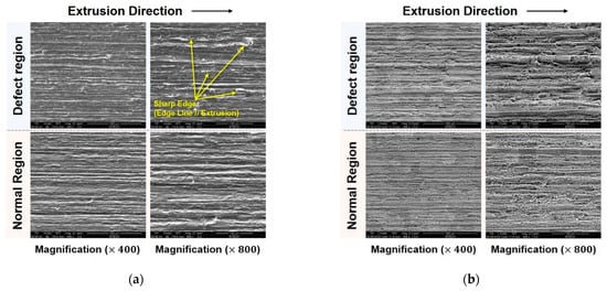 The white line defect on the surface of the workpiece can be observed either by the altered reflection of light owing to surface irregularities, or non-uniform anodizing during the aluminum coloring process performed after extrusion, which is closely related to the occurrence of the die line, grain boundary groove, and etching pit, and the disordered growth of the cellular structure during the grain etching step. Zhu et al. [30] reported that the altered reflection of light can be visibly detected beyond a surface roughness of 0.2 μm, based on the Rayleigh criterion of , which is also known as the smooth surface condition, considering a reflection angle of 60°. The parameters , , and represent the height of the surface defect, the reflection angle, and the wavelength of the light, respectively. Wavelengths detectable by the human eye are typically around 0.38–0.78 μm.