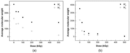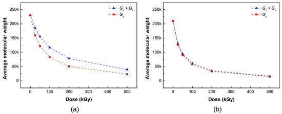 The changes in molecular weight are related to the radiation chemical yields of crosslinking (Gx) and chain scission (Gs), which determines the extent of chain scission or crosslinking during gamma-ray irradiation, and can be calculated from the following equations [27]: