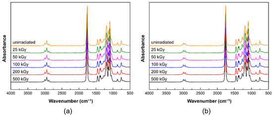 ATR spectra of gamma-ray-irradiated biodegradable polymer films were obtained using an ATR-FTIR spectrophotometer (Bruker TENSOR 37, Bruker Corporation, Billerica, MA, USA). The spectra were measured in the wavenumber range from 500 to 4000 cm−1 in ATR mode. Spectra were recorded using Bruker OPUS software (version 8.5, Bruker Corporation, Billerica, MA, USA) at a resolution of 4 cm−1.