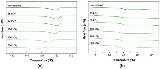 Figure 4 shows the DSC curves of PLCL and PLDLA before and after gamma-ray irradiation. The DSC curve of the PLCL film before exposure had a melting point (Tm) of 159.78 °C. No significant differences were observed up to a dose of 100 kGy. However, Tm decreased rapidly when the dose was increased to 200 and 500 kGy, indicating that gamma-ray irradiation resulted in the degradation and scissioning of the main chain [20,37].