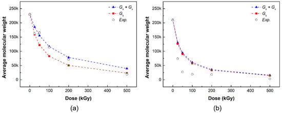 In addition, in Equation (7) derived from this study, the slopes α and β are correlated with the G value, and thus the radiation damage model is an important factor in simulating the actual evaluation experiment. To reflect the change in the initial number of molecules (N0) due to molecular formation through chain cleavage and crosslinking, 0.5 and 2 were applied to the slopes α and β, respectively. The average molecular weight change curve was also determined.