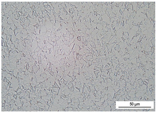 The experimental material AISI 316L is Cr-Ni-Mo austenitic stainless steel (wt. %: Cr 16.97, Ni 14.75, Mo 2.50, Mn 1.76, C 0.03, Si 0.49, Cu 0.15, Fe balance) purchased in the form of rectangular specimens 15 mm × 40 mm × 2 mm (BEZNOSKA Slovakia Ltd., Banská Bystrica, Skovakia). Its microstructure (Figure 1) is formed by polyhedral austenitic grains with numerous twins, which could be created by annealing or by rolling.