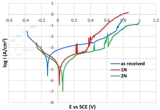 As shown in Figure 7, the shape of polarization curves is typical for passivating metals (passive anodic branches reflecting the control of the anodic dissolution rate by the passive current density) [24] and therefore the corrosion potential (Ecorr) values were determined directly from the PP curves (Tafel extrapolation was not applicable).