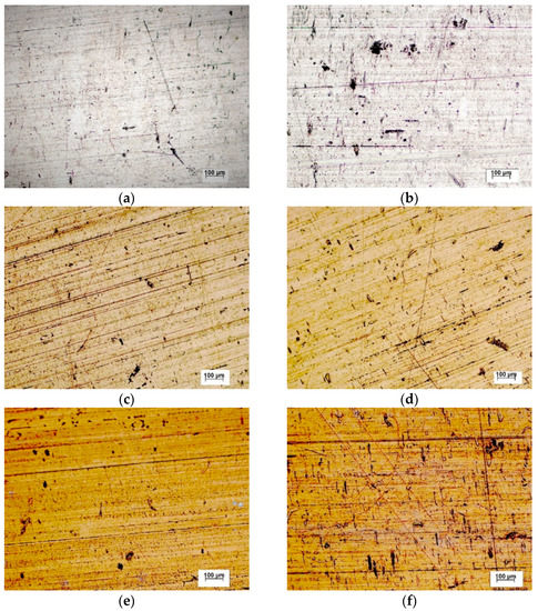 The tested stainless steel surfaces before and after 50-days exposure (optical microscope): as received surface (a) before, (b) after; 1N surface (c) before, (d) after; 2N surface (e) before, (f) after.